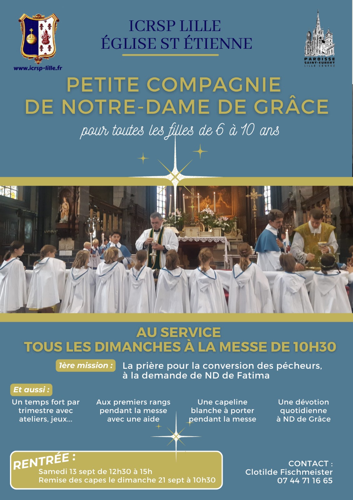 💙 Petite Compagnie de Notre-Dame de Grâce 🔔 Journée de rentrée samedi 13 septembre de 12h30 à 15h Pour inscrire vos filles (avant le mercredi 10 septembre) : https://forms.gle/6E5GYDQK1wMcUSe69 La Petite Compagnie est une confrérie proposée aux petites filles en l'honneur de Notre Dame d'Annay, appelée aussi Notre-Dame de Grâce, vénérée à l'église Saint-Etienne, afin [...]