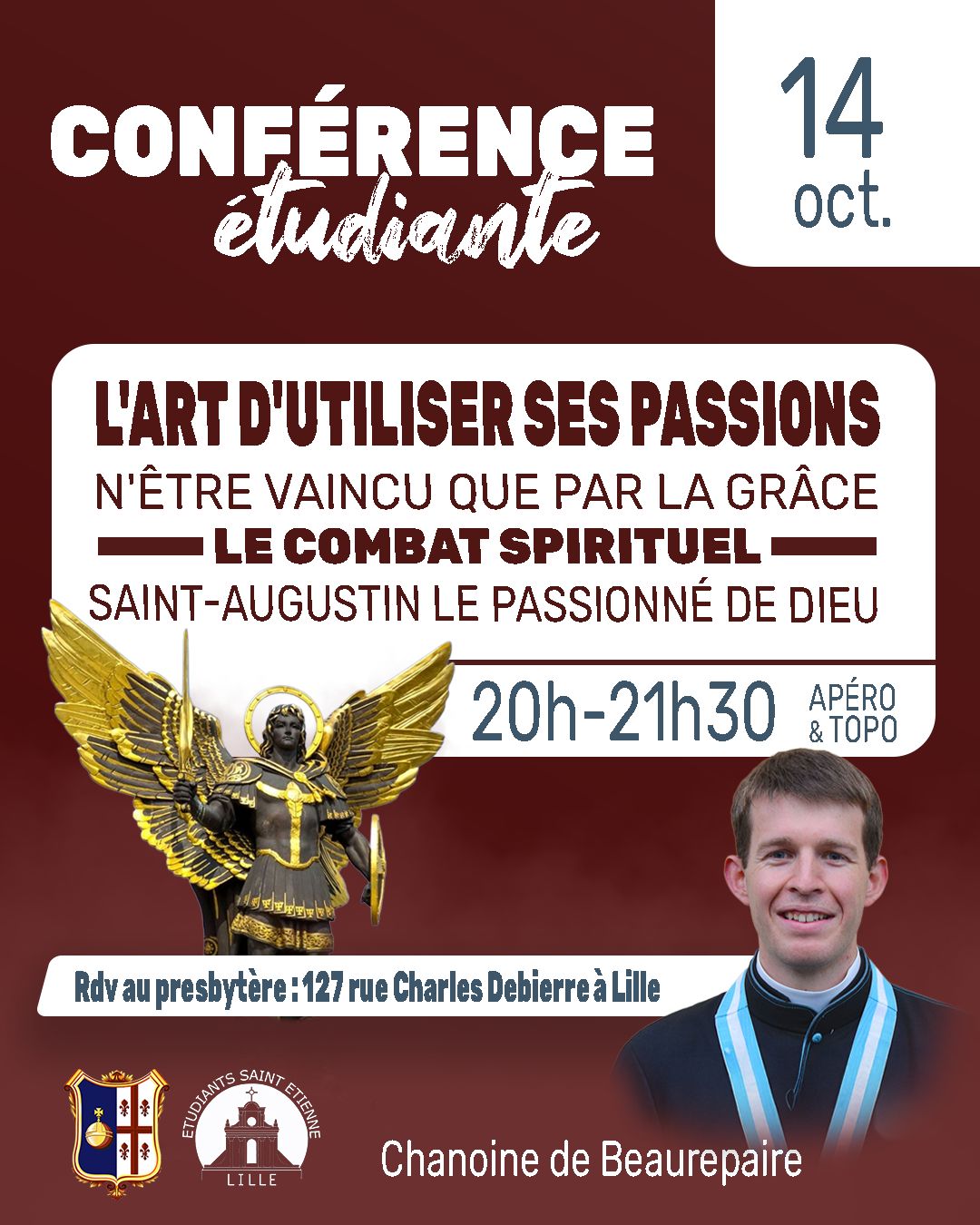 PROCHAINE CONFÉRENCE ÉTUDIANTE - MARDI 14 OCTOBRE A vos agendas ! 🖊️📆 • messe des étudiants à 19h à Saint-Étienne • puis apéro au presbytère Saint-Sauveur suivi de la conférence ! - 127 rue Charles Debierre, Lille. Nous vous attendons nombreux, amenez vos amis 🤗 😋 Apportez tous de quoi partager un bon apéro ! [...]